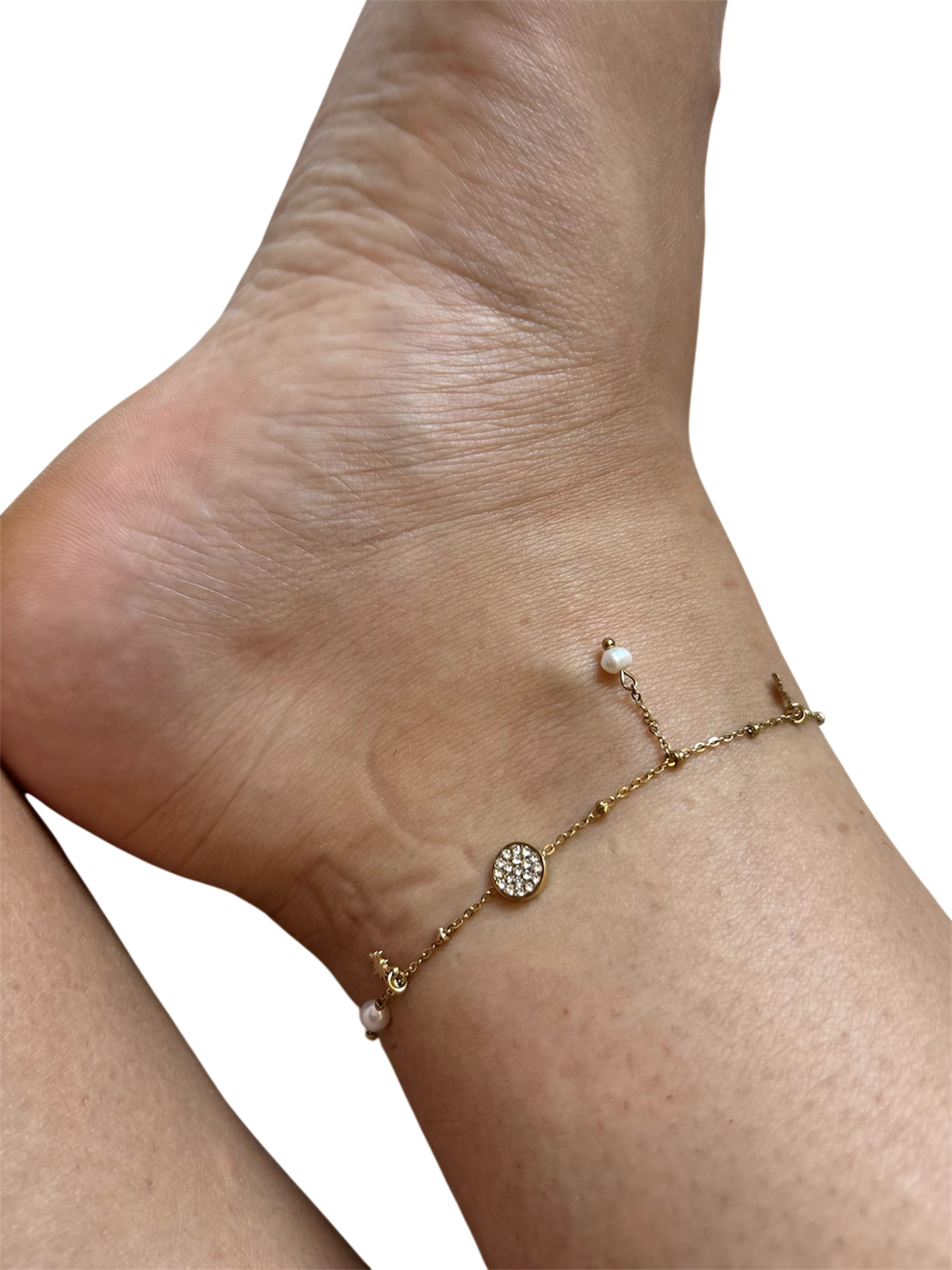 - Bracelet de cheville sur chaîne en acier doré composé d'une chaîne à boules, de perles d'eau douce, de pampilles étoilées et d'une pampille ronde sertie d'oxydes de zirconium.