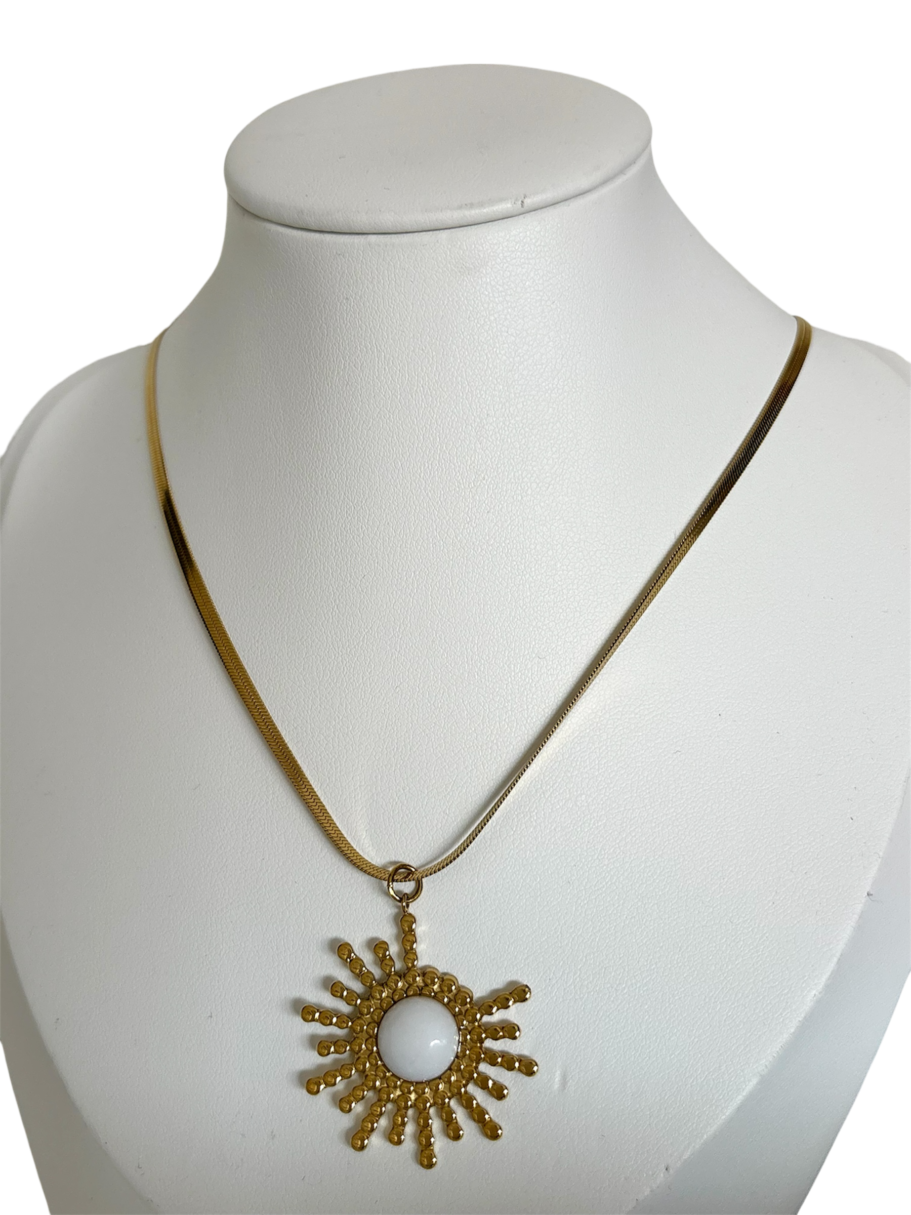- Collier composé d'une chaîne maille plaque en acier doré, ainsi qu'un pendentif en forme de graphique solaire texturée, et orné d'une véritable pierre naturelle.