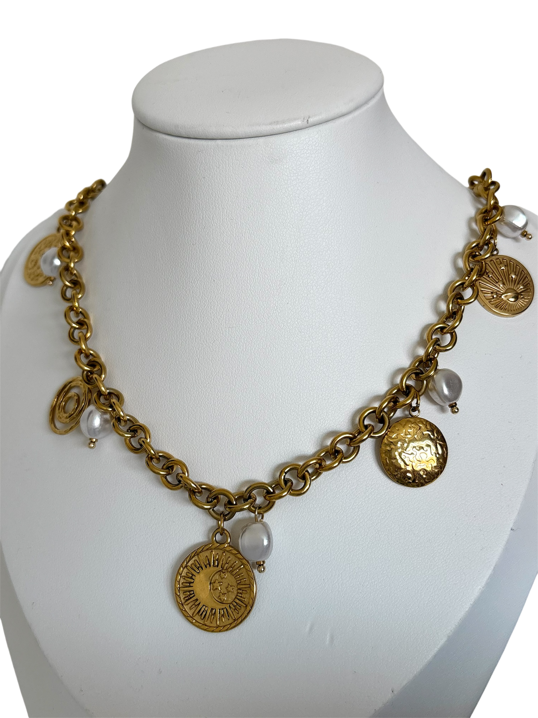 - Collier sur chaîne en acier doré composé d'une maille jaseron épaisse, embellie par des breloques diverses dont de véritables perles d'eau douce.